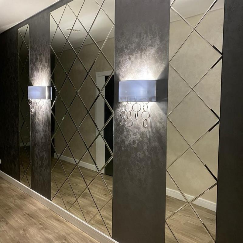 Зеркально панно было сделано из зеркальной плитки 30х30 см, размер панно 255х255 см